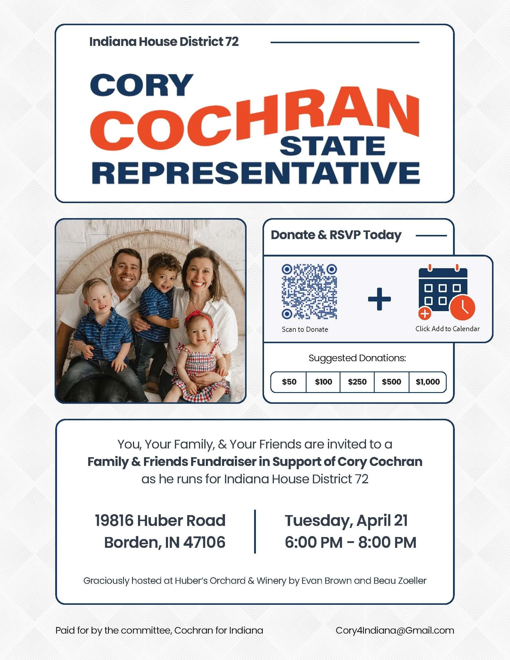 Join us for our Friends and Family Fundraiser: Tuesday, April 21st 6:00-8:00pmHuber’s Orchard & Winery Click here to add to your calendar